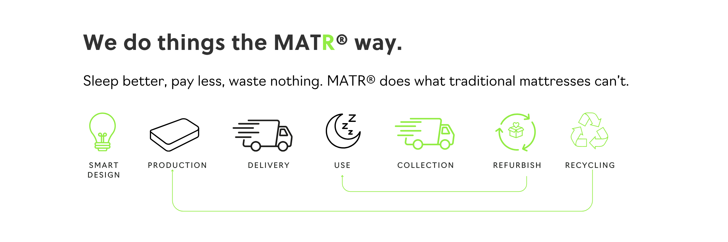 MATR has crafted a circular economy mattress that combines premium comfort with sustainable design, ensuring you get the best rest while protecting the planet. Choose MATR for a smarter sleep solution that values your well-being and the environment. Join us in making a difference, one mattress at a time.